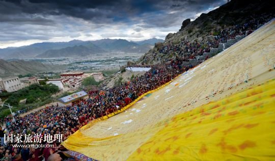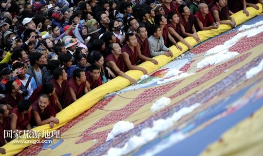 國家旅游地理 西藏拉薩8月6日訊 8月6日,拉薩哲蚌寺舉行展佛儀式。當日,以西藏最大的格魯派寺廟哲蚌寺展佛為開端的雪頓節(jié)在拉薩拉開序幕。每年藏歷六月底七月初是西藏傳統(tǒng)的節(jié)日“雪頓節(jié)”。在藏語中,“雪”是酸奶子的意思,“頓”是“吃”“宴”的意思,“雪頓節(jié)”按藏語解釋就是吃酸奶子的節(jié)日,因此又叫“酸奶節(jié)”。因為“雪頓節(jié)”期間有隆重熱烈的藏戲演出和規(guī)模盛大的曬佛儀式,所以有人也稱之為“藏戲節(jié)”“曬佛節(jié)”。 /新華社記者 普布扎西攝