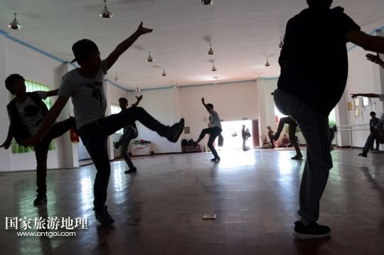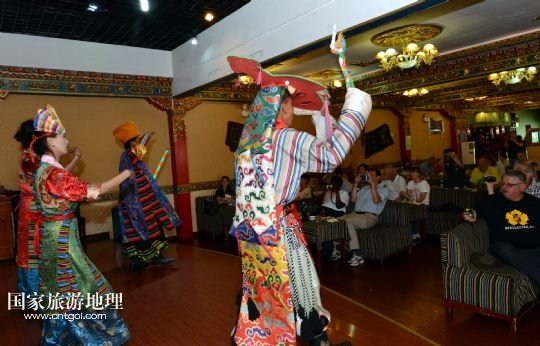 8月4日,在西藏拉薩,覺木隆藏戲團(tuán)的演員們?yōu)橐患屹e館的客人演出。