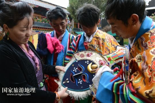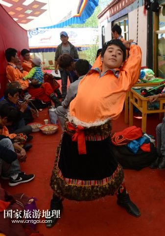 8月6日,在西藏堆龍德慶縣乃瓊鎮(zhèn)甲熱村舉行的雪頓節(jié)曬佛慶典上,甲熱村覺木隆藏戲團(tuán)的演員們?nèi)雸霰硌荨?/p>