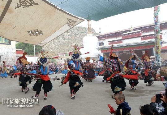 8月6日,在西藏堆龍德慶縣乃瓊鎮(zhèn)甲熱村,甲熱村覺木隆藏戲團(tuán)在村里的雪頓節(jié)曬佛慶典上表演。