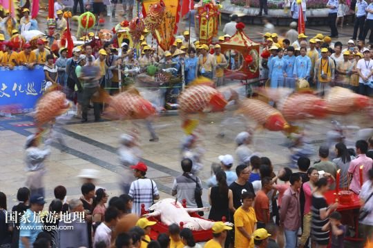 國家旅游地理 浙江寧波9月14日訊 9月14日,在浙江省寧波市象山縣,當?shù)貪O民在進行漁區(qū)民俗文化表演。當日,浙江寧波象山縣舉行漁區(qū)民俗文化巡展,魚燈、馬燈、百獸燈、船燈等13支表演隊為游客奉獻了精彩的民俗表演,展現(xiàn)了象山燦爛的民俗文化和獨特的海洋風情。 /新華社發(fā)(張培堅 攝)
