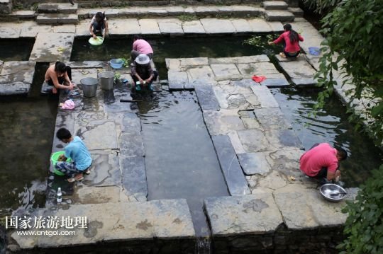 9月26日,在廣西昭平縣黃姚古鎮(zhèn),人們?cè)谝豢诠啪韵床?、洗衣服?/p>