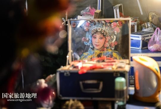 1月3日,武義壺山婺劇團演員在上臺前整理頭飾。