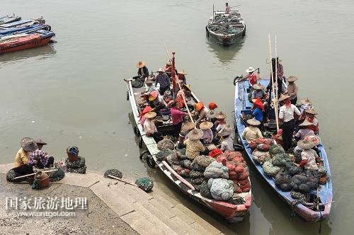 5月11日,在福建泉州豐澤區(qū)東海街道蟳埔社區(qū)文興碼頭,勤勞的蟳埔女們乘船出海。