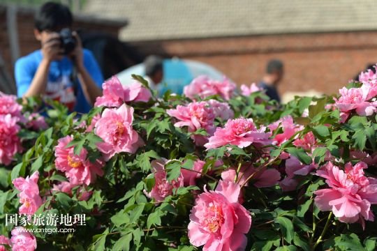 5月23日,游客在內(nèi)蒙古寧城縣長(zhǎng)皋村烏氏家族的庭院里拍攝的盛開的牡丹花。