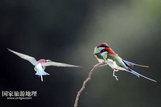 國家旅游地理 江西九江6月14日訊 6月14日,藍(lán)喉蜂虎在鄱陽湖畔的樹枝上休憩。進(jìn)入夏季以來,位于我國第一大淡水湖江西鄱陽湖畔的九江市廬山區(qū)姑塘鎮(zhèn)迎來了眾多美麗的小鳥藍(lán)喉蜂虎。